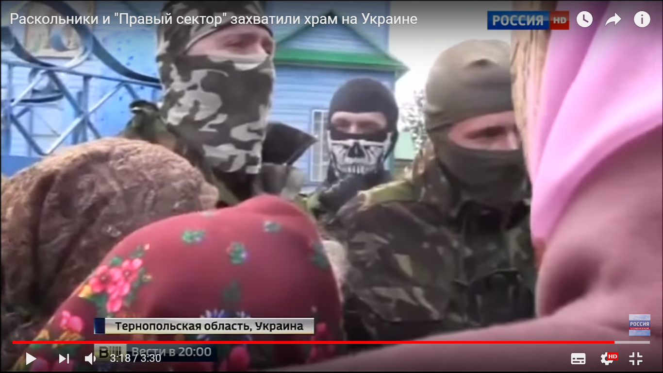Parfois aussi les uniates tentent, eux aussi avec l'aide de Secteur droit, de prendre possession des églises orthodoxes du Patriarcat de Moscou, ressortant les mêmes "arguments" que les radicaux, dont le principal est que tout prêtre de cette Eglise ne peut être qu'un agent des services spéciaux russes, voir la vidéo ci-dessous dans le village de Kolomy: